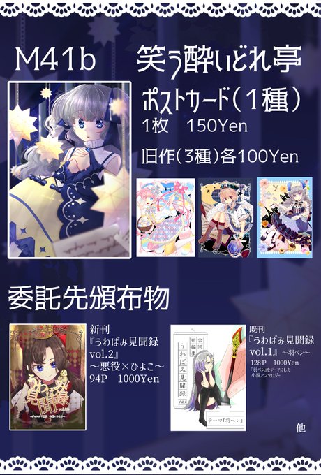 ✨#COMITIA139 おしながき✨ スペースNo.:『M41b』 明日2/20(日)のコミティア139にて、 『笑う酔いどれ亭』( @warau_yoidore )さんのスペースにお邪魔して、ポストカードを4種(旧絵柄3種+新絵柄1種)頒布させていただきます✨ 当日は私と飛鳥ちゃんが在席します!よろしくお願いします🥰✨
