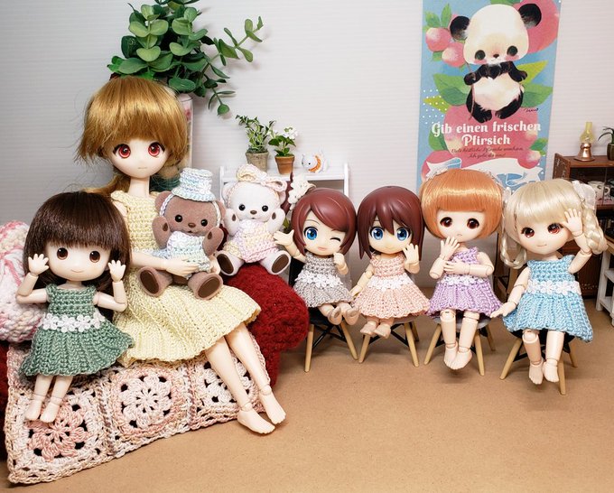 2 15 全員集合~😆✨ Can★Doの椅子たち大活躍💓 増えてきたな~~~w😁💦 #ねんどろいどどーる #オビツ22 #Honeybear #キューポッシュ #オビツ11 #かぎ針編み #レース糸 21/06/04 15:41