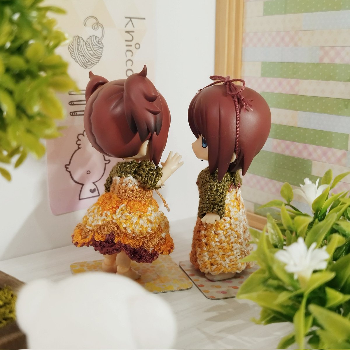 ブラウンワンピ祭り🍫💕 子供たちが夏休みが始まる前に なんとか形になって よかった…‼️ 世の保護者の皆様…!共に乗り越えましょう!😂🌻 #キューポッシュ #オビツ11 #オビツ22 #Honeybear #ねんどろいどどーる #かぎ針編み #レース糸