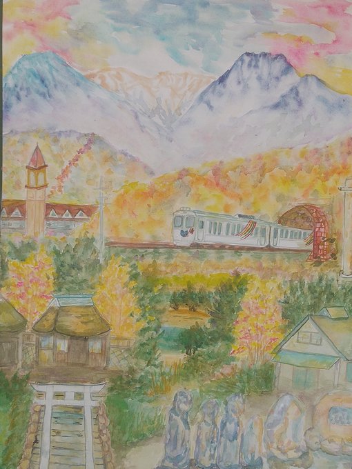 #水彩画 #透明水彩絵の具# #風景 #三五山鉄道 #あづみの # 20号 #ワトソン紙 # ボカシ タッチをたくさん使う