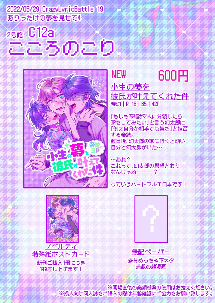 【8/21インテクレリリ新刊サンプル】 スパダリになりたいヘタレバブ帝×積極的男前な幻の本です🍒(画像繋がってません) B5/表込24P/全年齢/400円 当日は「5号館か04b」にて頒布いたします!よろしくお願いします🥳 長いの→pixiv.net/artworks/10051… 通販→ec.toranoana.jp/joshi_r/ec/ite… #帝幻本