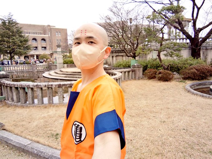 リアルでは 【“鼻が無い”クリリン】 をやることは難しいので、画像加工アプリで鼻を消してみたが……🤔 なかなかの違和感🤣 というか怖い😂 #コスプレ #コスプレイヤーさんと繋がりたい #ドラゴンボール #クリリン
