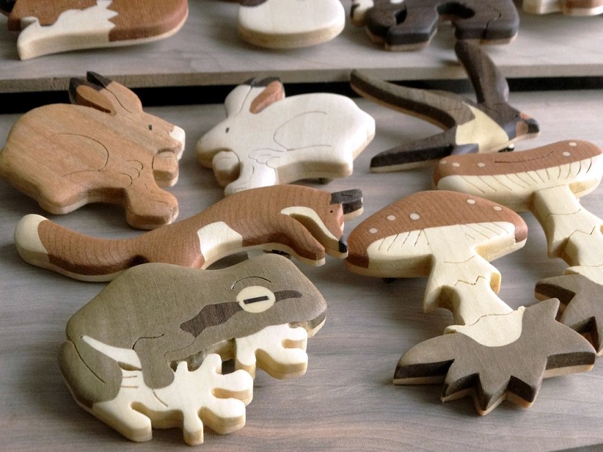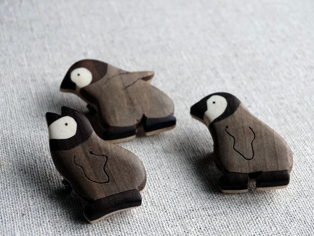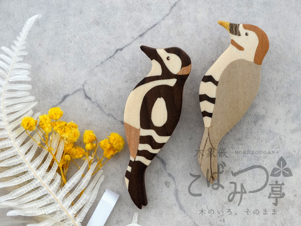 さまざまな色の木をパズルのように組み合わせる木象嵌(もくぞうがん)という技法で、いきものブローチを1個ずつつくっています。 色を塗らなくても天然木の色彩はこんなに豊か♪ #多分私しかやってない