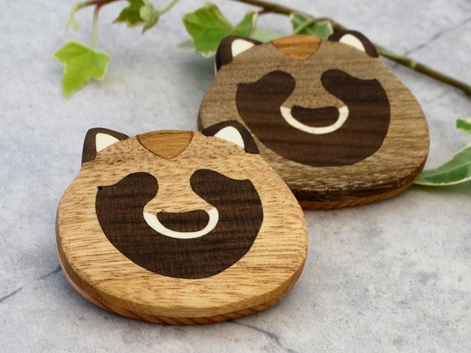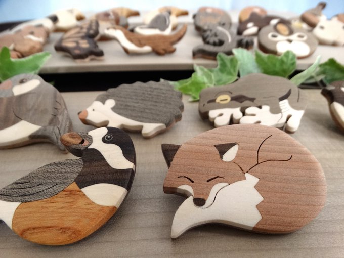 天然の白い木・黒い木・赤い木などをパズルのように組み合わせて模様をつくる『木象嵌(もくぞうがん)』という技法を用いて、キツネ・アマガエル・タンポポなどいろんな生き物のブローチをつくっています。色は塗っていません! #私の作品もっと沢山の人に広がれ祭り