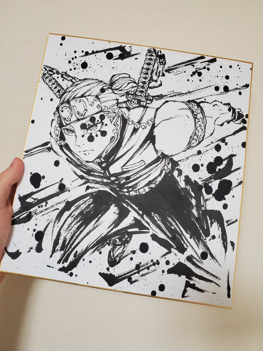 色紙に煉獄さんと猗窩座描きました☺️ #鬼滅の刃 #DemonSlayer #無限列車編 #煉獄杏寿郎 #猗窩座 #模写 #墨絵 #イラスト