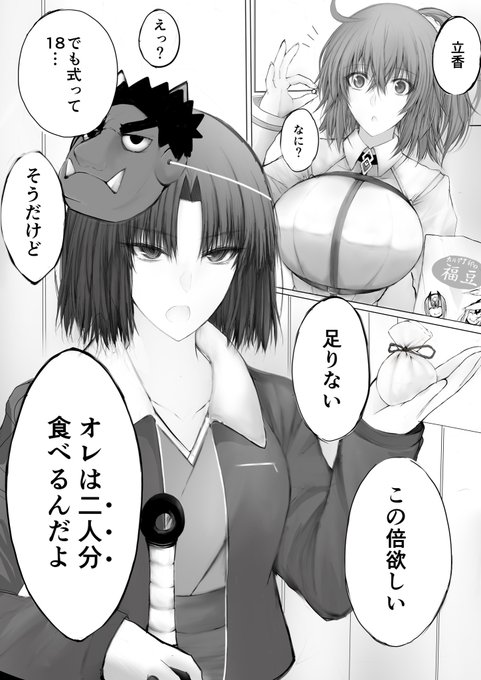 「楽しかった、マシュ?」 「はい、 先輩! これが節分なんですね」 「うん 式も鬼の役なんか頼んじゃってごめんね」 「いいよ、鬼の役ならお安い御用だ」 「それで、最後に年の分だけ豆を食べるんだよ」 「まず式の分ね 1、2、3・・・はいどうぞ」 「じゃあ次はマシュの分ね」 「・・・」