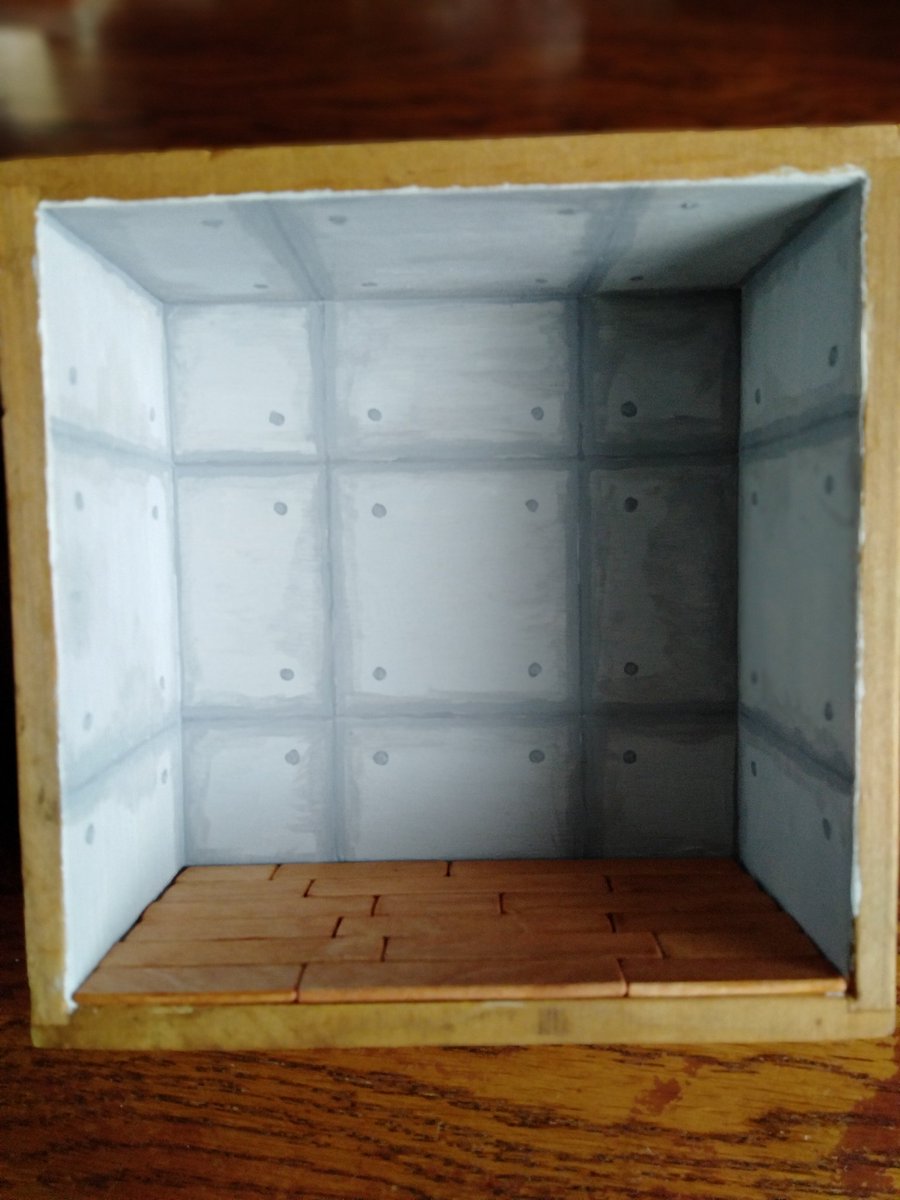 5 65 今回のドールハウスの壁はコンクリの打ちっぱなし風なんですが、アクリル絵の具で模様を描きました🖌👍✨(娘に『お母さん天才』と言われた🤣) 床は最初カーペットの予定でしたが、何か違うと思ってフローリングにしました😊 #ドールハウス #ミニチュア #ハンドメイド #ドール #miniature 22/03/16 09:45