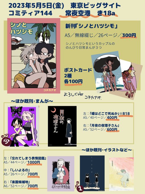 【お品書き】 5月5日(金)コミティア144に 常夜空港 スペース き18a で参加します 新刊まんが「シノとハツシモ」他既刊のまんが、イラスト本があります 「蝶はどこで死ぬか」は残り少なく、「しいよるの」は残り一冊です お取り置きの相談ができる場合があります #コミティア144 #COMITIA144