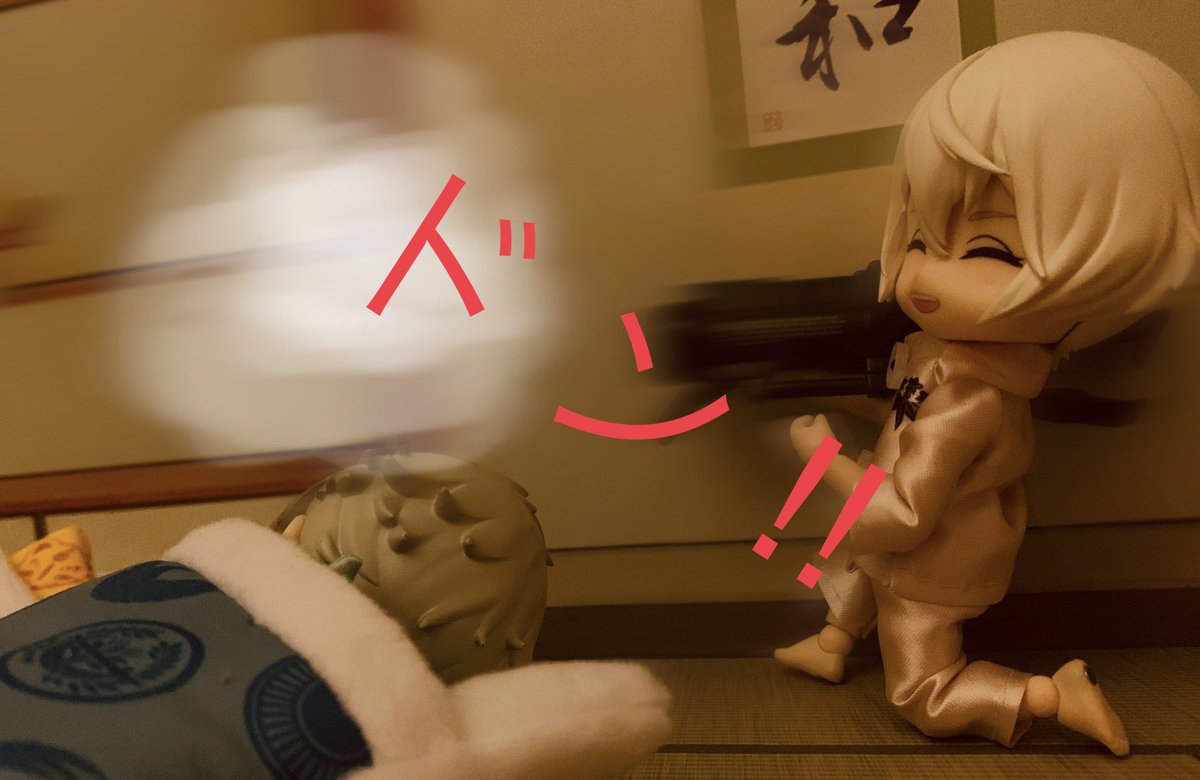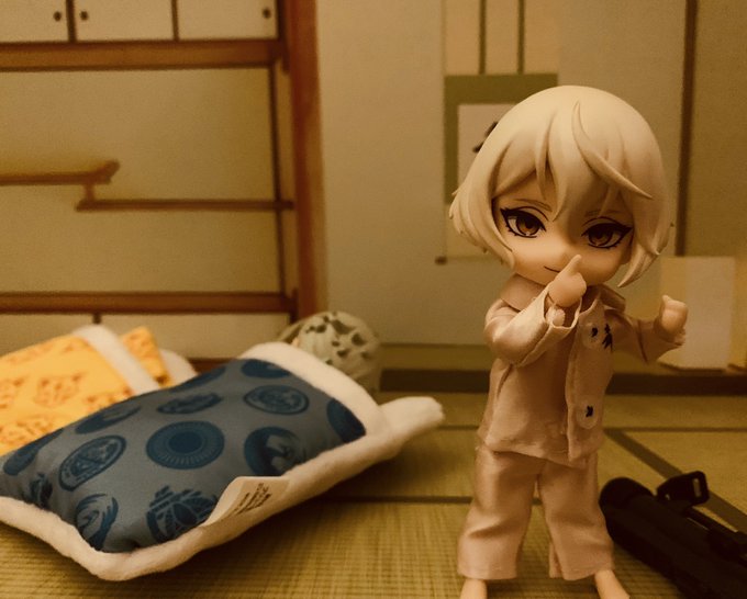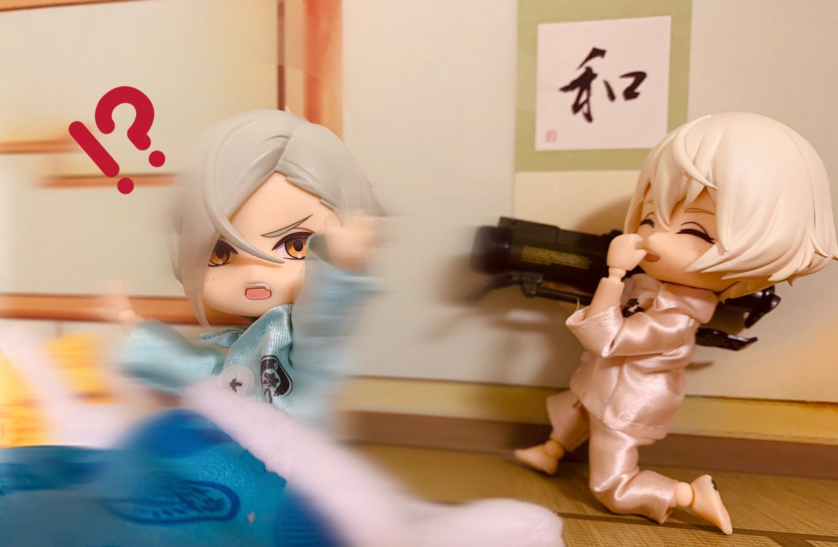 寝起きドッキリバズーカ。 兄者が早起きするとろくなことがない。 今朝の出来事。 #ねんどろ刀剣男士 #本丸視察
