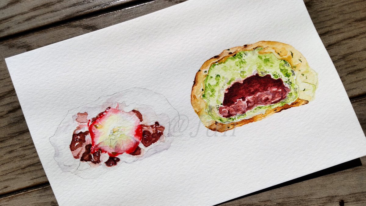2022/3 苺大福とよもぎつぶあんぱん やっぱりパン生地むずかしいーっ けど、描くのは楽しいーっ けど、水張り嫌でやってないから紙が波打ってる~😅 #透明水彩 #水彩画 #アナログイラスト #食べ物イラスト #みんなで楽しむTwitter展覧会