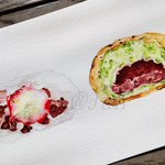 3 42 2022/3 苺大福とよもぎつぶあんぱん やっぱりパン生地むずかしいーっ けど、描くのは楽しいーっ けど、水張り嫌でやってないから紙が波打ってる~😅 #透明水彩 #水彩画 #アナログイラスト #食べ物イラスト #みんなで楽しむTwitter展覧会 22/04/02 08:33