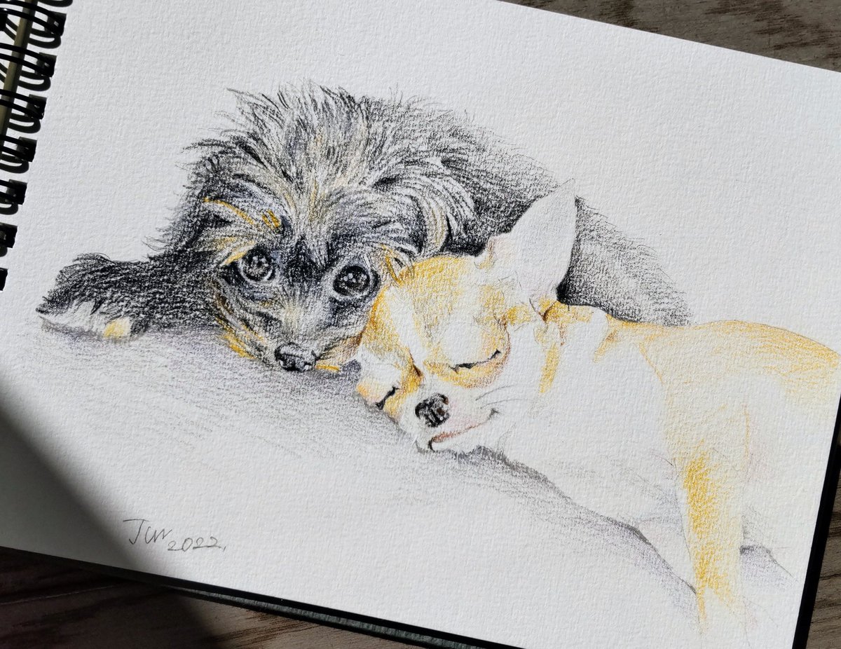 1 24 色鉛筆の練習でスムースチワワとチワプーを描いてみました 当たり前だけど水彩のようには混色できないので表現がむずかしかったです💦 #アナログイラスト #色鉛筆 #わんこ 22/10/01 11:22