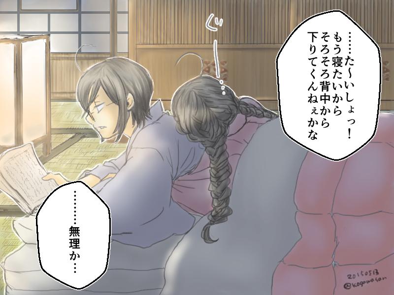 52 233 【薬さに♀】…だって薬研の背中に乗って ぎゅうって抱きついたら、気持ちよくって安心して眠れるんだもの… #刀さに同衾企画 15/05/13 01:37