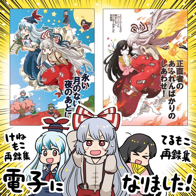 おしらせ! オールキャラ系再録集に続いてけねもこ、てるもこの再録集をメロンさんで電子にしてもらいました! よかったらよろしくお願いいたしますー! ■正直者のあふれんばかりのしあわせ!(てるもこ) melonbooks.co.jp/detail/detail.… ■永い月のない夜のあとに(けねもこ) melonbooks.co.jp/detail/detail.…