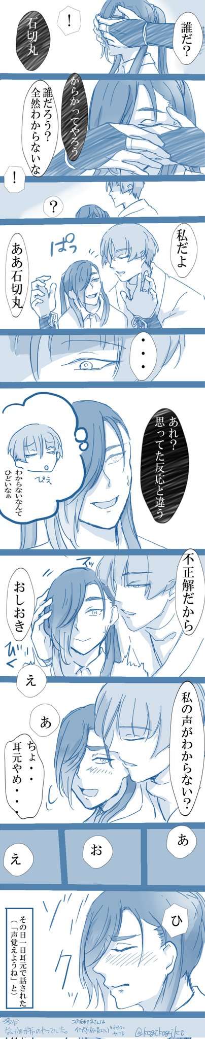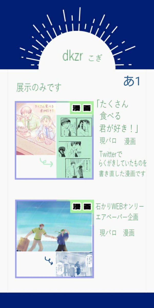 13 27 左上の端っこの「あ1」にいます!今回かいたやつとエアペーパーどっちも現パロになっちゃったから当日はほんまるのふたりのらくがきでもできたらいいね。 #石かりwebオンリー202307_お品書き 23/07/13 05:47
