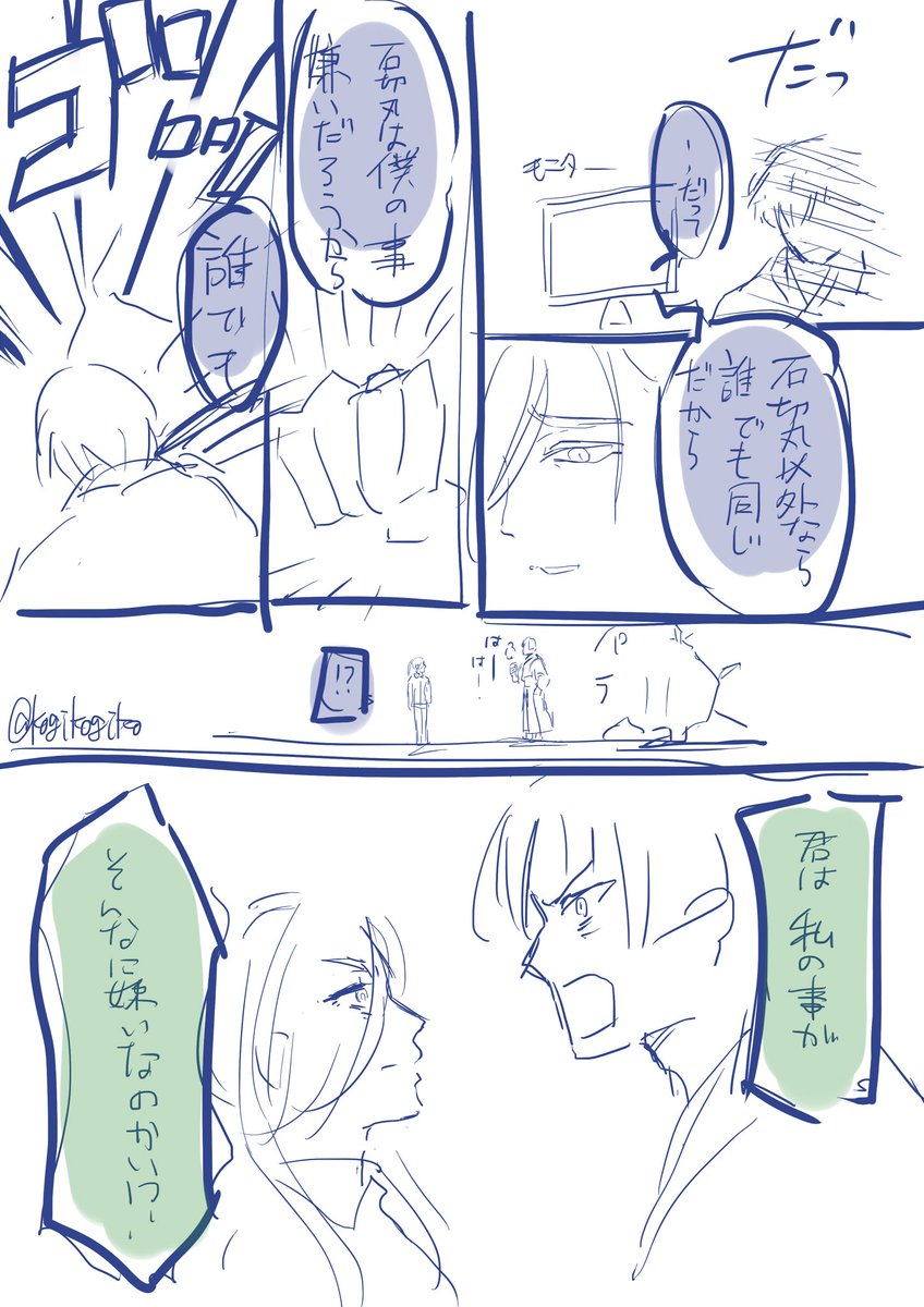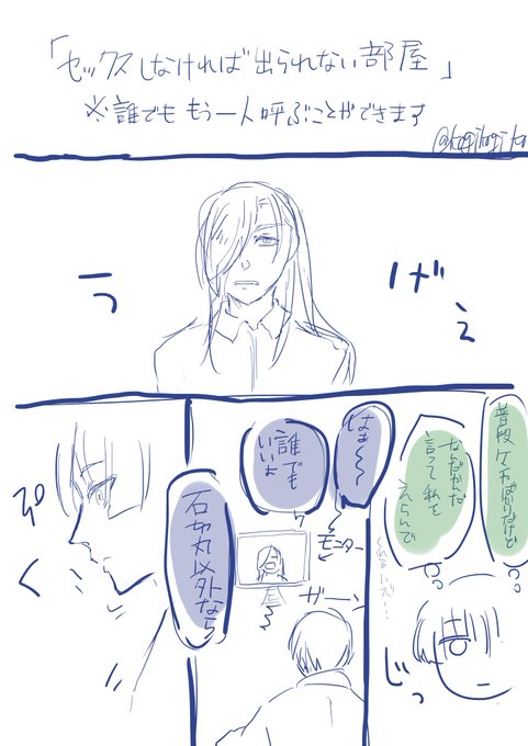 19 71 この前つぃったで見たフリーお題のやつ けんかっぷる?(つきあってない)石かりらくがきまんが 部屋はもう出れるんですけど 22/11/02 17:19