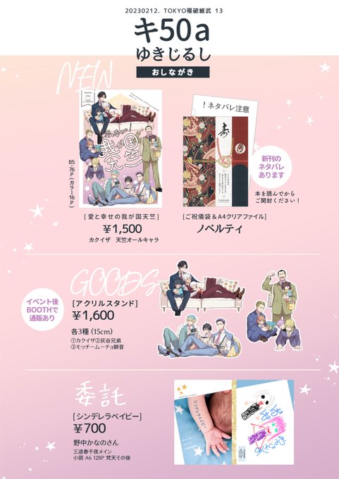 48 202 🌸2/12 東4キ50a「ゆきじるし」おしながき ・アクスタはイベント後BOOTH通販します ・ノベルティのクリアファイルは新刊のネタバレを含みます。本を読んでからご開封ください ・新刊は前のページから順にお読みください。(仕掛けがあるので、先に奥付から開かないようにお願いします…! 23/02/09 17:58