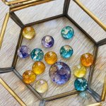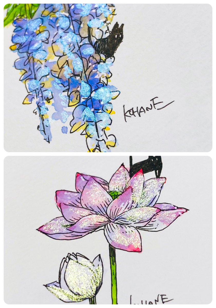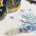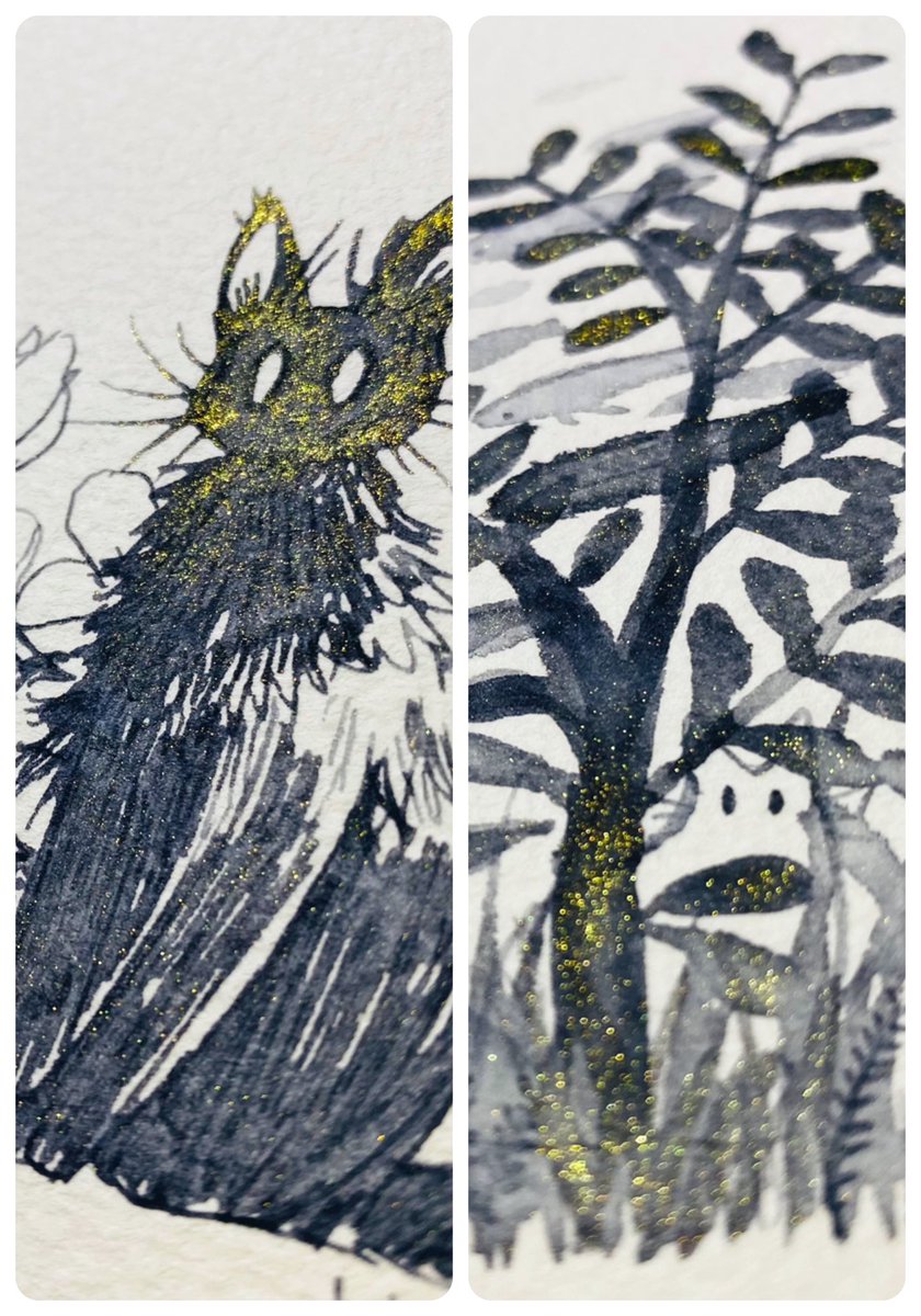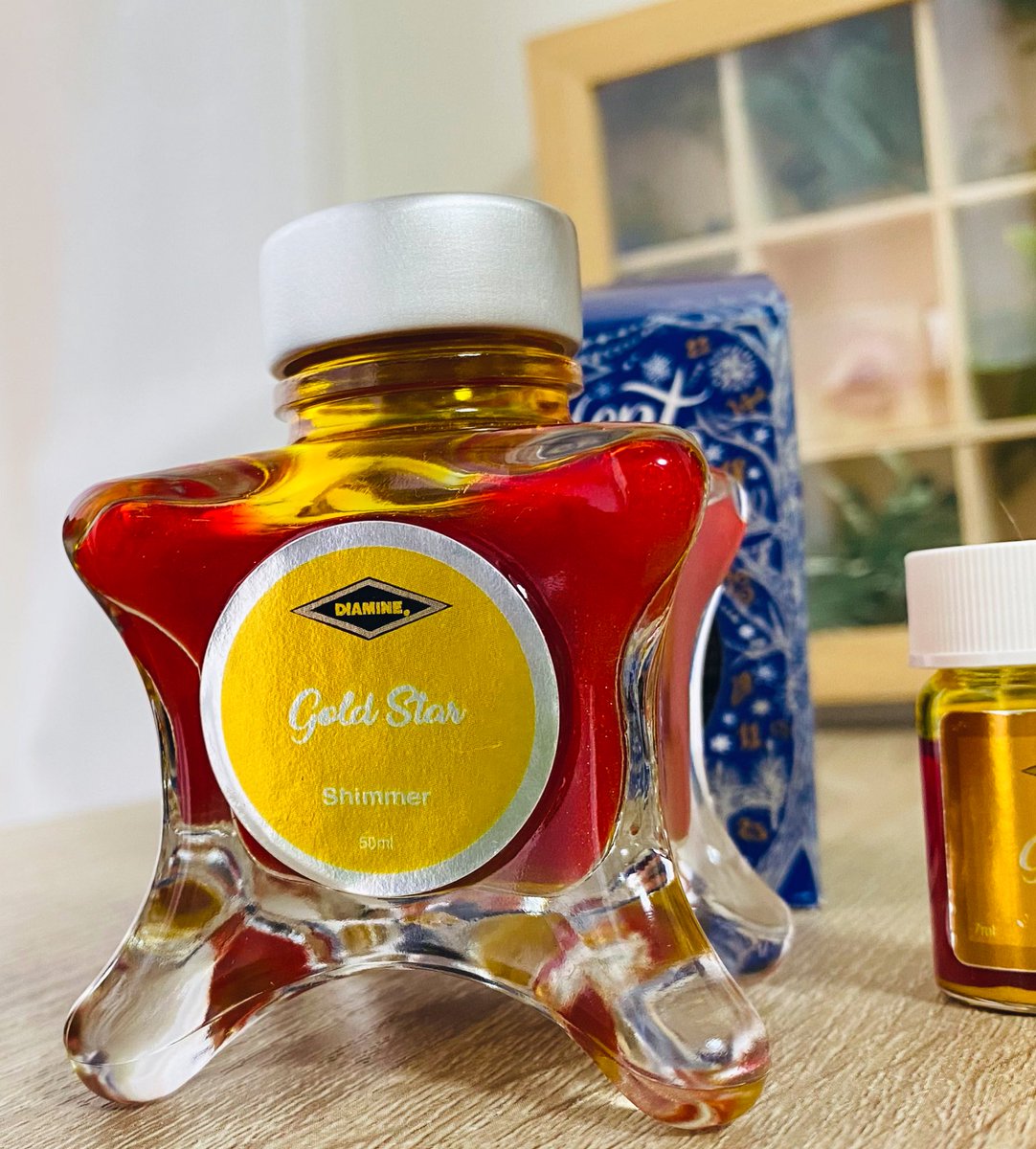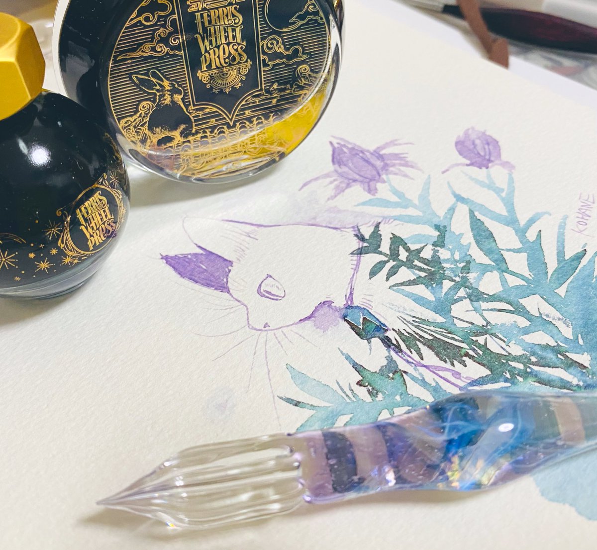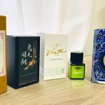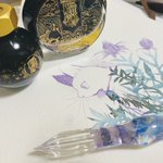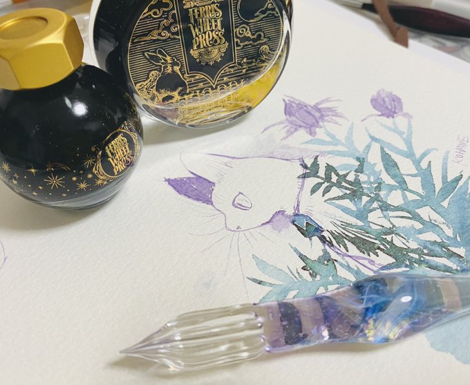 今更ながら参加させていただくインク5色こちらです 極地幻舞 鬼丸国綱 GOLDDUST Appletini Gold Star ダイアミンのブルーエディションの瓶のかわいさとGOLDDUSTの色味詐欺(褒め言葉)を見てほしい #インクイラスト合同誌 twitter.com/kohane503/stat…