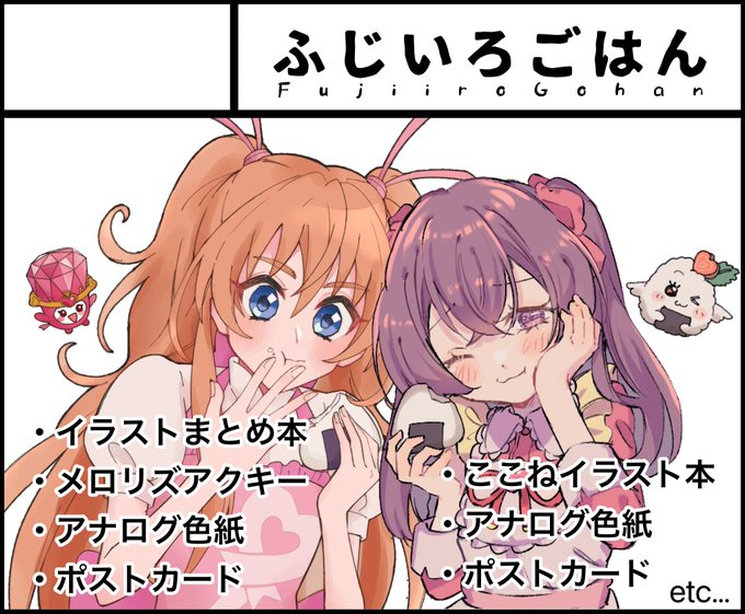 🍴4/23 #レイフレ28 おしながき🍴 睦稀ちゃん@p5vr_c_m と合同サークルです💜🍙 新刊+グッズのお得なスペシャルセットをそれぞれご用意してます! こはつんの新作はイラスト本とアクリル3種です! スペース番号【B85.86】でお待ちしてます〜!!🫶 #レインボーフレーバー28 #ふじいろごはん