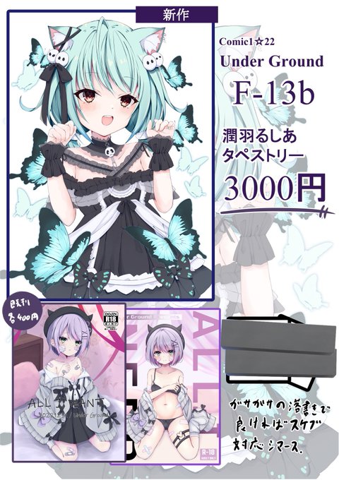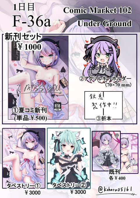 【お品書き】 Comic Market 102 1日目 F-36a 「Under Ground」 新刊セットならびにアクキーは初めて作成いたしました!折本はガサガサっと好きなもの雑多に描いてるかなと。 当日はよろしくお願いいたします! #C102 #C102お品書き 新刊通販🍈 melonbooks.co.jp/detail/detail.…