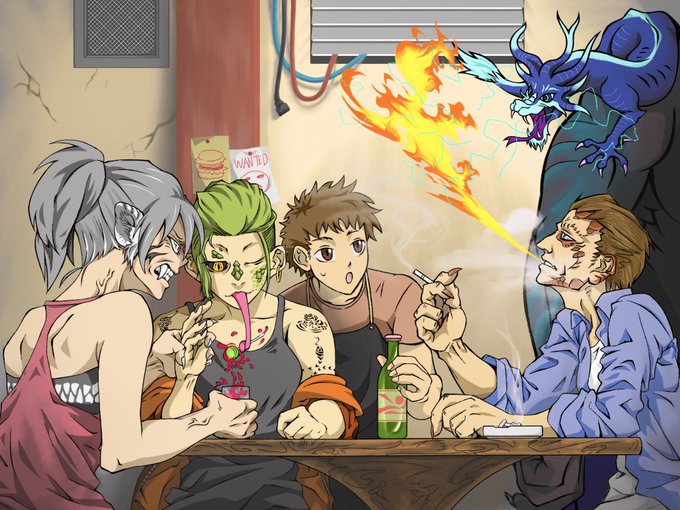 #オリジナルイラスト #イラスト #絵描きさんと繋がりたい #モンスターイラスト この前描いた絵を修正して背景を付けて見ました。半地下の小さい飲み屋をイメージして描きました。色合いが前よりアニメチックになって個人的にお気に入りです。