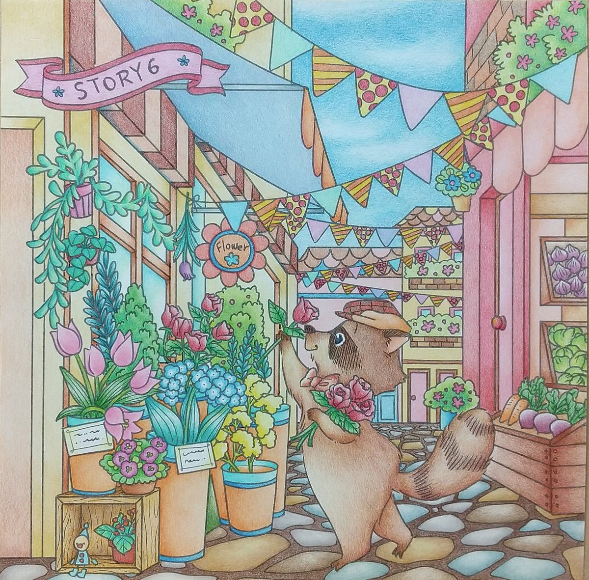 3 35 細かい小物が多い線画はやっぱりポリクロモスが塗りやすいなあと思いました。(作文) #大人の塗り絵 #色鉛筆 #うさぎさんのメルヘン空想図鑑 23/05/11 15:07