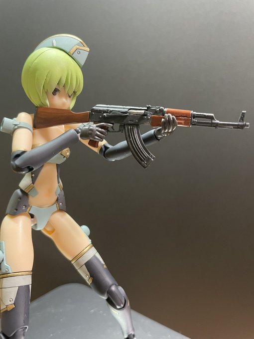 リトルアーモリーAKM。完成時にいいねを下さった方の作品に知見を得たので、ウッド部分を塗り直してみました。今まで気楽に作ってたけど、奥深いなぁ。モデルさんの胸は銃を構えるには大き過ぎたので、小さく作り替えました。場面で使い分けます😆 #リトルアーモリーを装備 #メガミデバイス