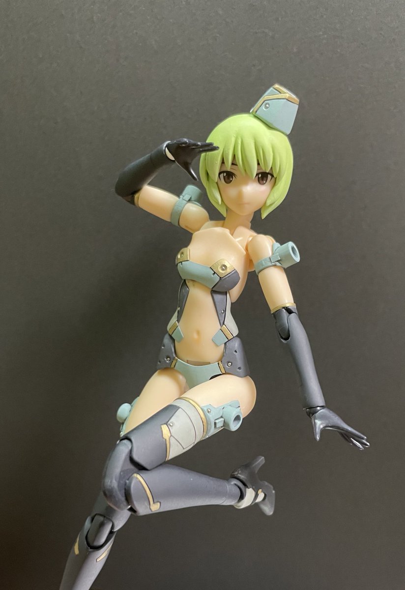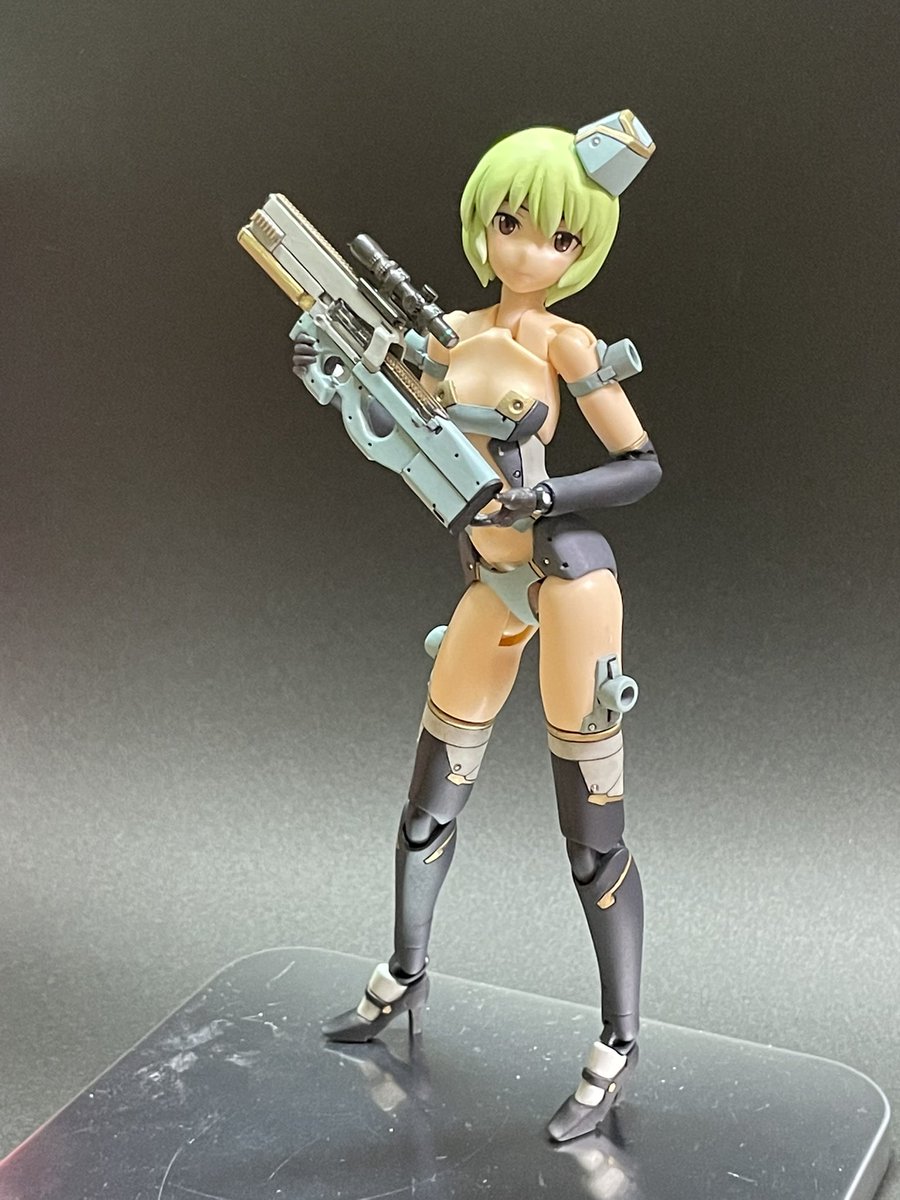 モデルさんVer2完成。銃火器の装備モデルという設定なので、肌の露出を抑えつつ、長すぎた腿を詰めてプロポーションの調整をしました。顔も2種類増やしたので、モデルとしての深みが増した・・・かな? 今日の装備は最近完成したVSSです。 #リトルアーモリーを装備 #メガミデバイス