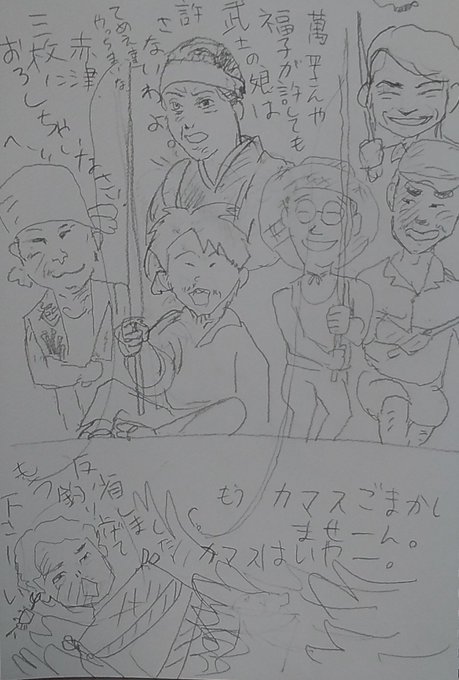 萬平さんと福子が許しても、武士の娘は許しません。子分ども、やっちまえ。 へーい。 #まんぷく #ぷく絵 #武士の娘 #塩軍団