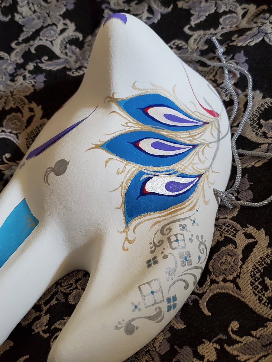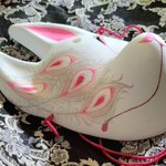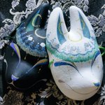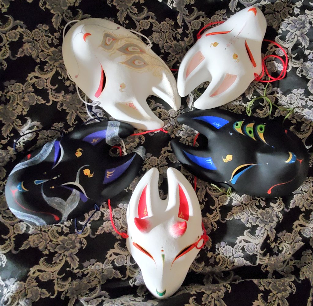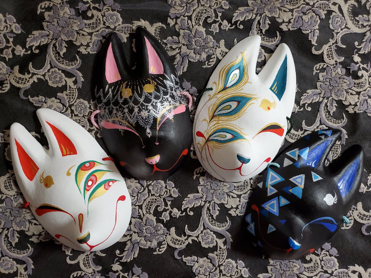 ・1号 ・多眼妖狐面 ・目隠しレース面 ・狐×孔雀の羽根×多眼面 初めて作った張り子面とこかとり堂と言えば!と自信を持って出せる子達ですね #この作品がなかったら今の自分は存在しなかったと言っても過言ではない作品