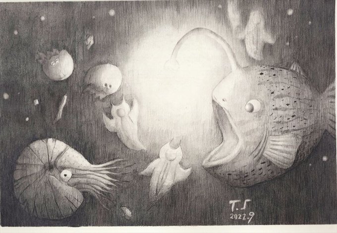 鉛筆でお絵描き。タイトルは『海の深いところの灯火』です。 描きあげるまでに時間かかりました。(T_T) でもまた描く。きっと描く。鉛筆で描く。 #鉛筆画 #みんなで楽しむTwitter展覧会 #お絵描き #pencil #pencildrawing