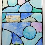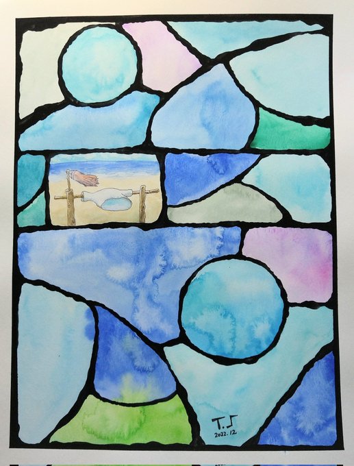 お絵描き、したどー!😊 タイトルは『ステンドグラスの隣接風景』、透明水彩、F6サイズです。 久しぶりの透明水彩、青っぽい色彩の絵を描きたかったの。 ステンドグラスの向こうにはTシャツたなびく海辺の風景。(^^)✨ #みんなで楽しむTwitter展覧会 #透明水彩 #お絵描きさんと繋がりたい