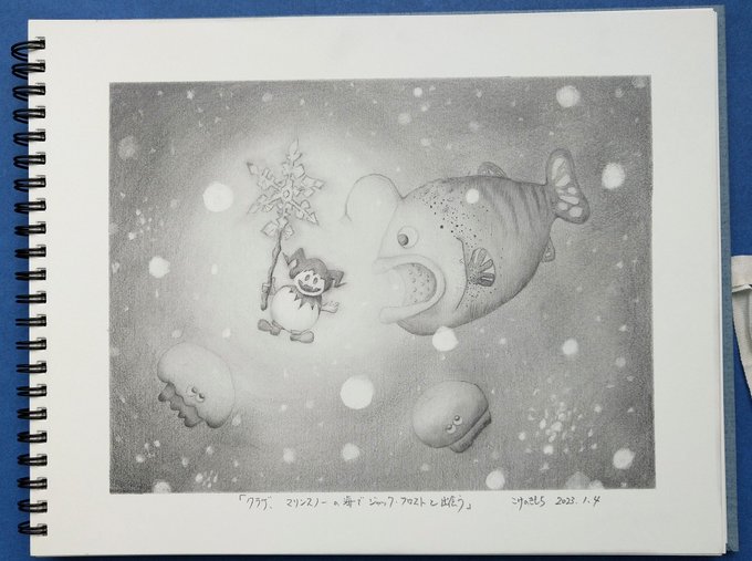 新年最初のお絵描き。鉛筆画です。 タイトルは『クラゲ、マリンスノーの海でジャックフロストと出会う』です。 なぜかクラゲを描いちゃう。(^.^; 今年もクラゲくんを描き続けます。😊 #鉛筆画 #お絵描き好きさんと繋がりたい #Pencildrawing #みんなで楽しむTwitter展示会 #新春私の作品広まれ祭り