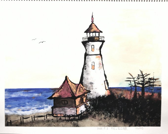 少し前に描いた風景画、タイトルは『灯台の見える風景』、画材はアクリル絵の具です。 色味が変。(^.^; やっぱり新しいスキャナーが欲しいな。 #お絵描き #風景画 #みんなで楽しむTwitter展覧会 #お絵描き好きな人と繋がりたい