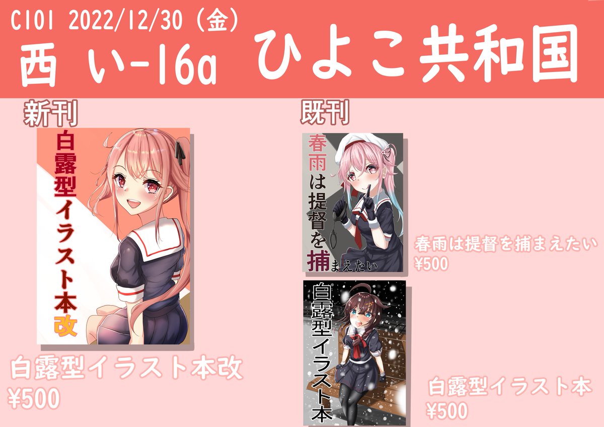1 1 C101のお品書きです! 新刊として白露型イラスト本改 既刊として春雨は提督を捕まえたい 白露型イラスト本を出す予定です なおすべて500円です! #C101 #C101お品書き 22/12/29 20:14
