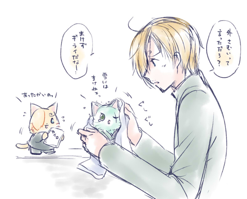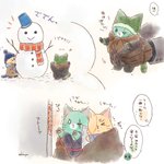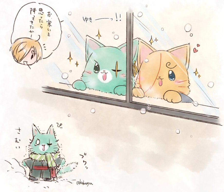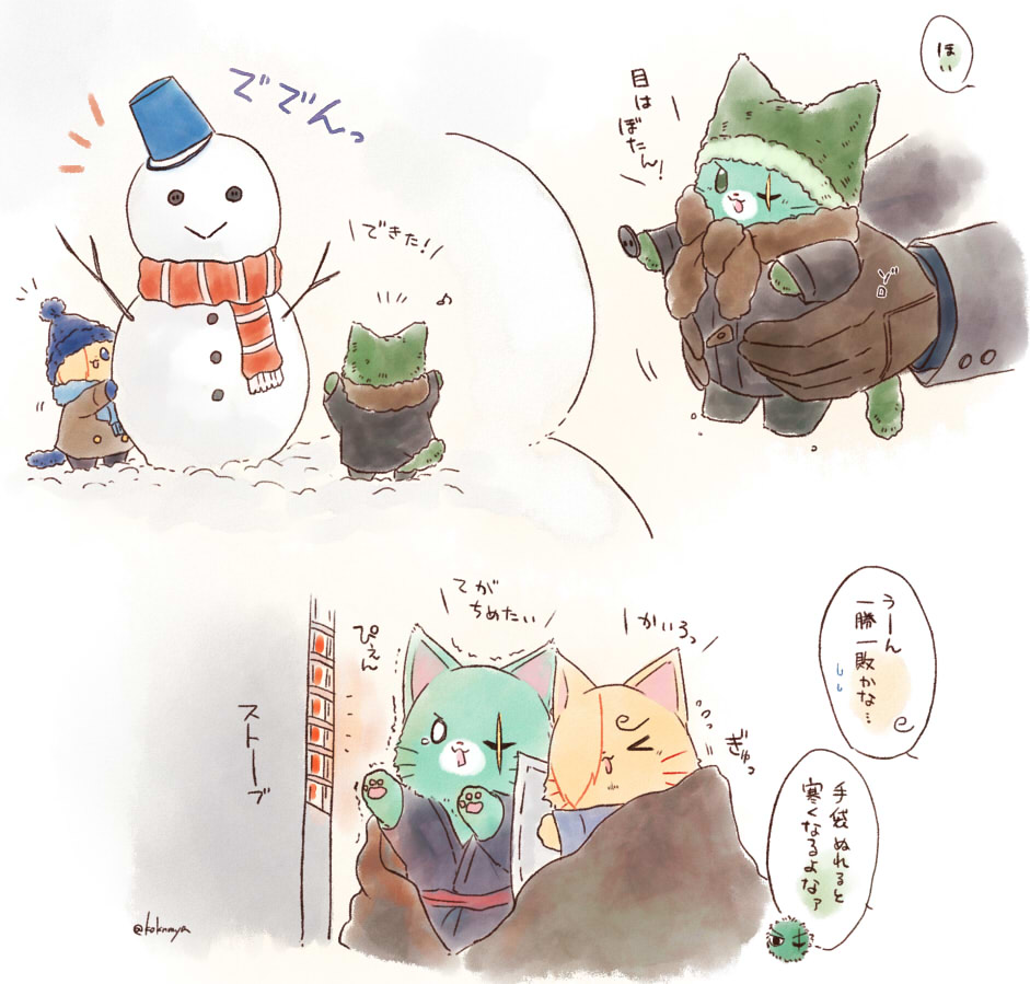 60 541 雪に勝ちたいにゃんのために飼い主サくんが帽子と手袋としっぽ袋作ったよ🧶 (緑の方の飼い主は笑いをこらえている)(※現パロゾサにゃんです) 22/02/11 06:38