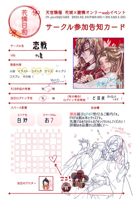 28 154 🌸花憐日和ご案内🌸 白妙お7「恋戦」で参加しています。漫画展示と紙本&アクスタの再募集とかお知らせとか~~です!よろしくお願いします❤ #花憐日和 22/02/18 23:58