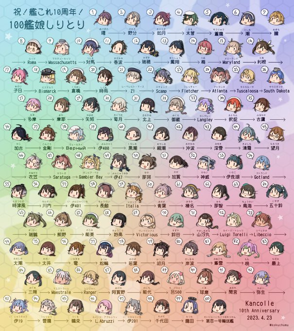 1624 4948 祝🎊艦これ10周年! 100艦娘しりとり #艦これ10周年 23/04/23 12:00
