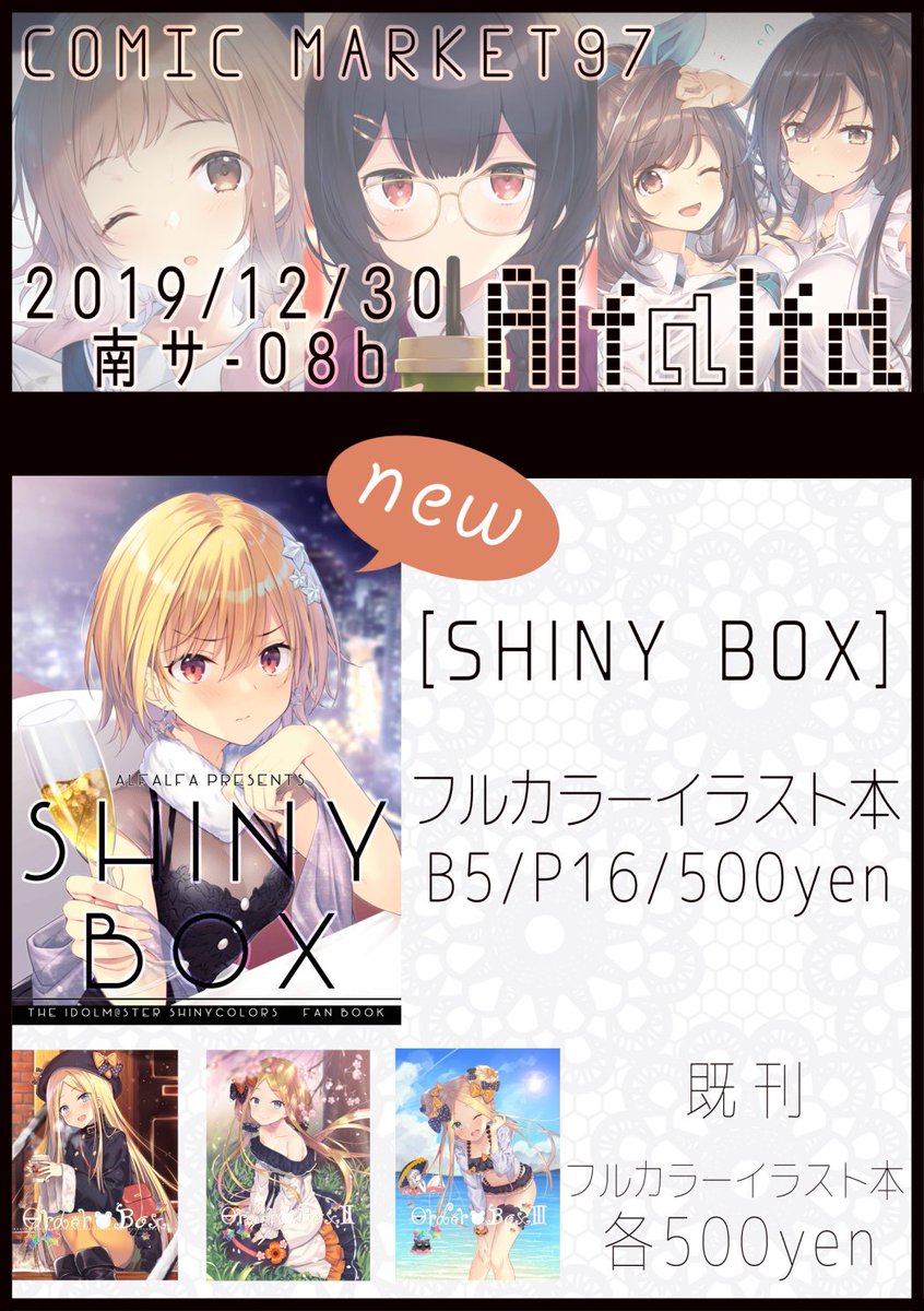 あなたのサークル「Alfalfa」は、コミックマーケット97で「月曜日南地区 "サ " 08b」に配置されました!コミケWebカタログにてスペース配置場所公開中です! webcatalog.circle.ms/Circle/Map/148… #C97WebCatalog シャニマスのイラスト本作ります!よろしくおねがいしますー!