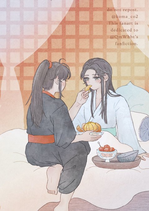 宴側さんの小説「夏に酔う」から一場面を描かせて頂きました🍊☺️ 夏の蓮花鵡の夕暮れ、夏酔いした藍湛を見舞う魏嬰くんの恋の始まり、甘酸っぱい夏蜜柑、熱っぽく見つめる潤んだ眼差し… 夢のように可愛くて初々しい忘羨ちゃんのお話です🥲✨とても好きで何回も読み返している… 心の栄養です