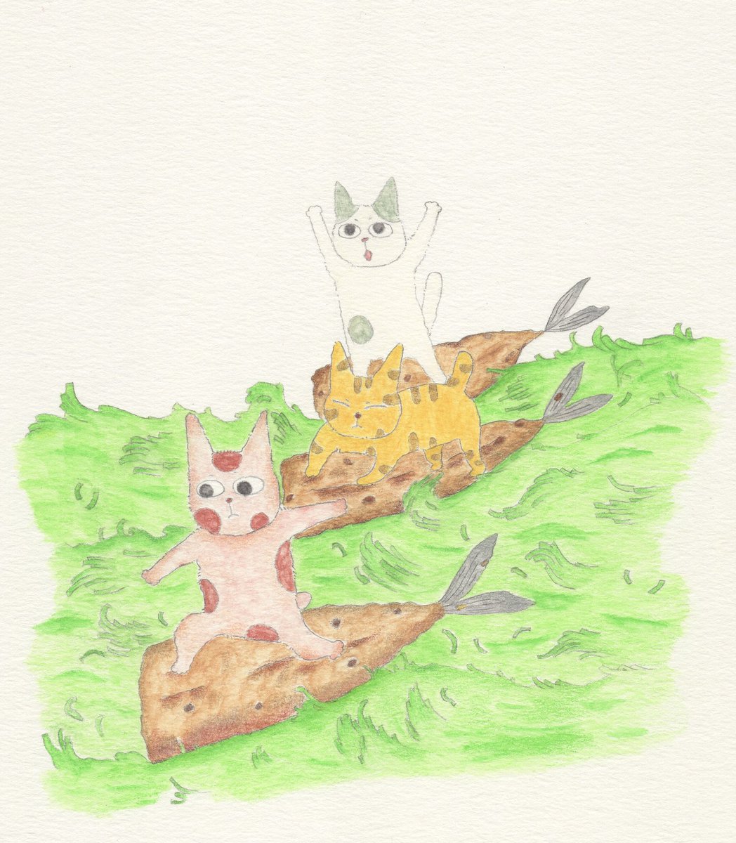 カレーみたいな猫かいてる。猫じゃらしサーフィン。 #イラスト #色鉛筆画