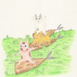 0 6 なんかよく分からんけど猫じゃらしに乗ってる猫。猫じゃらしサーフィン。猫じゃらしといえば猫用オモチャのカラフルなやつです。 #イラスト #色鉛筆画 22/02/27 14:28