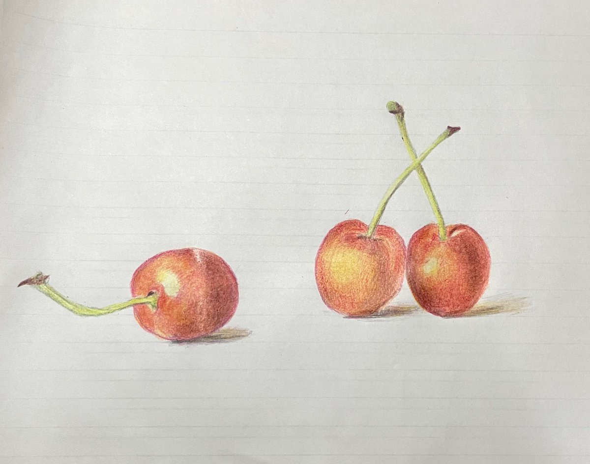 0 4 色々挑戦してみたくて。 色鉛筆画も初挑戦してみたり… 片桐剛さんの動画を参考にさせていただきました。 下手だけど、美味しそうな食べ物を自分の手から生み出してるぞっていう感覚が楽しい…!!🍒 #色鉛筆画 #さくらんぼ 22/06/28 22:50
