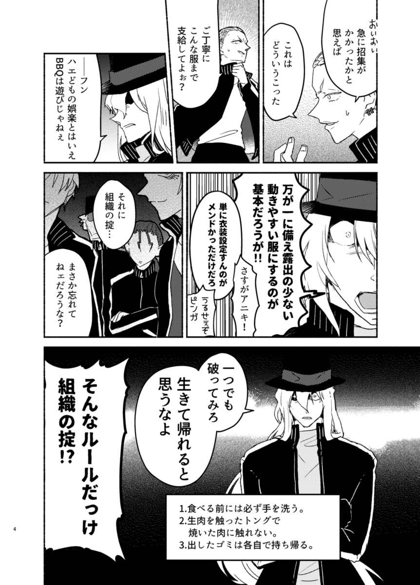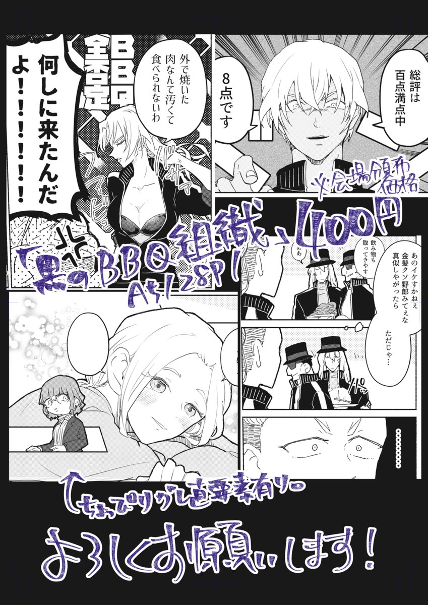 8/20新刊サンプルです。黒の組織がBBQではしゃいでる話です。 『黒のBBQ組織』全年齢/A5/28P/400円(会場頒布価格) インテ6号館Dツ46aにてお待ちしております! 当日は会場限定ノベルティ有り。 🐯予約→ec.toranoana.jp/tora_r/ec/item… (1/2)