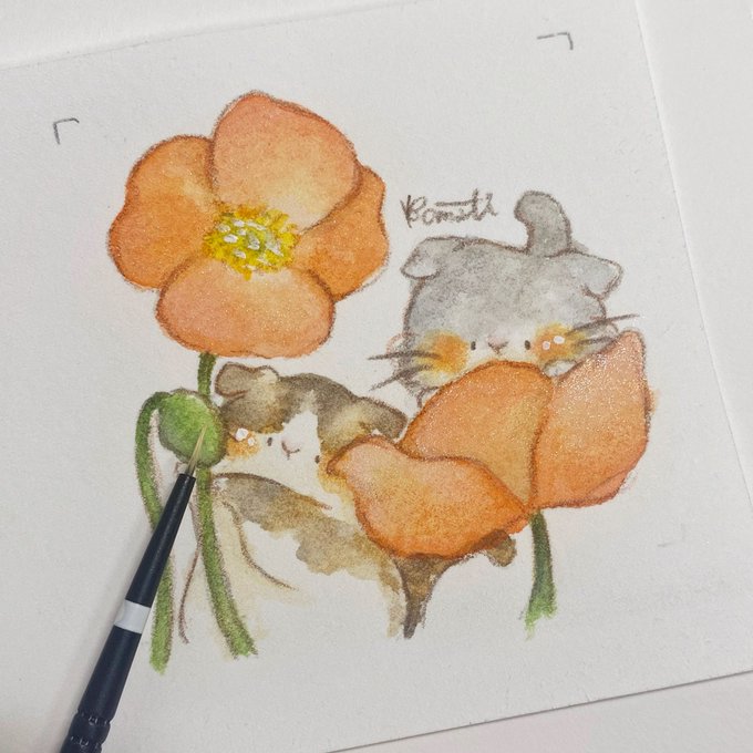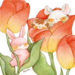 ポピーとたわむれて チューリップのお届けです 3/29〜4/2 #笑顔の咲く展示会2023 (東京にて委託参加)に展示販売予定のミニ原画です🌷 今回の新作ミニ原画はお花のところがキラキラしています✨ #こまちのミニ原画 #動物イラスト