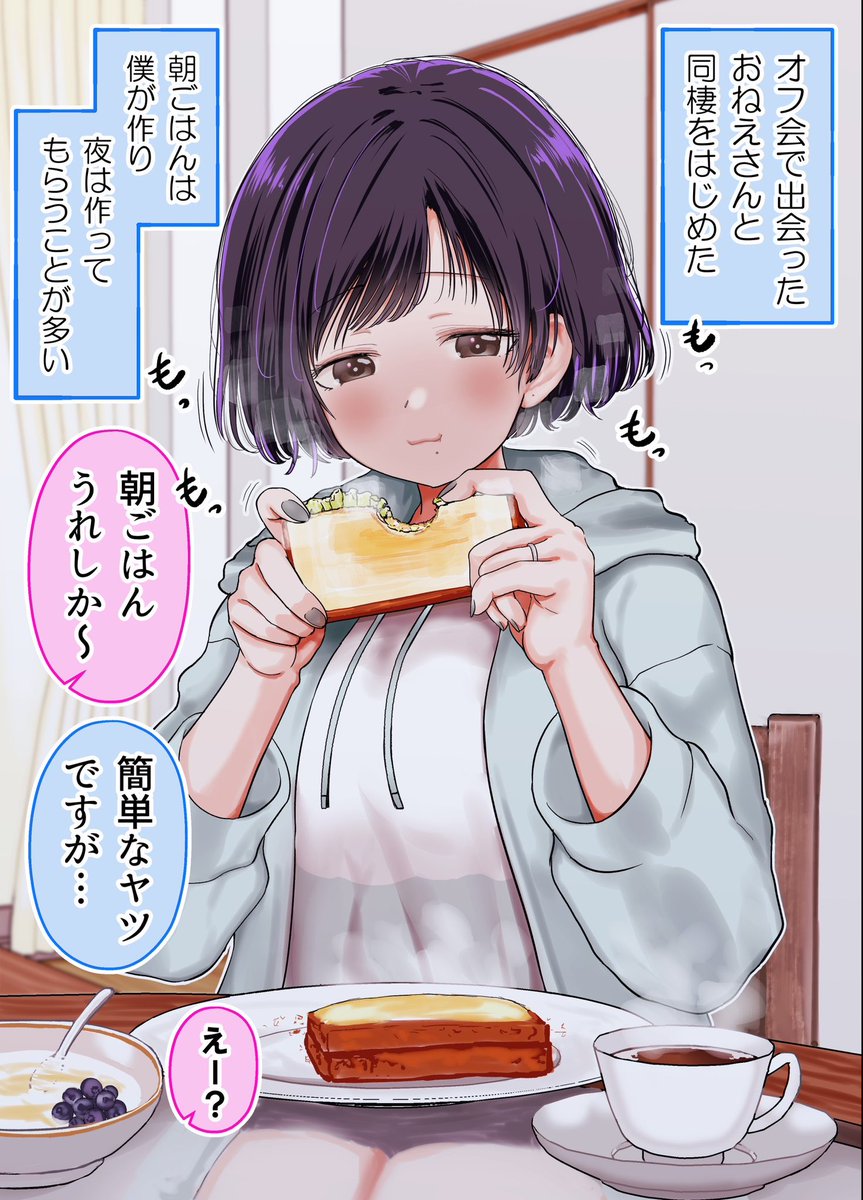 オフ会で出会ったおねえさんと家で朝ごはんを食べてる(1/2)