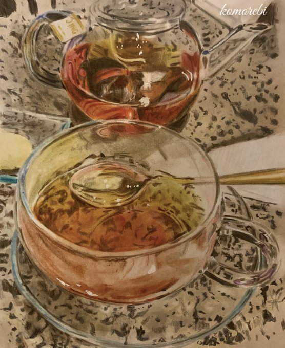色鉛筆画 再 "Tea Time" 練り消しゴム多用 ホワイトペンは使わずに ぼんやり柔らかに〜 色鉛筆 ファーバーカステル パンパステル ホルベイン 練り消しゴム #木漏れ日のお絵描き