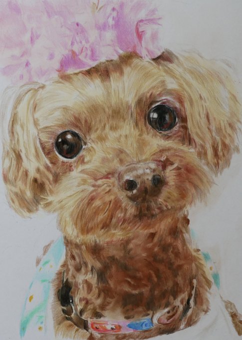 色鉛筆画 お友達にお願いされていた "トイプードルの女の子" 完成しました ピンクのリボン くしゃくしゃの巻き毛 まんまるの瞳 が可愛いです 色鉛筆 ファーバーカステル パンパステル ホルベイン #色鉛筆画 #木漏れ日のお絵描き