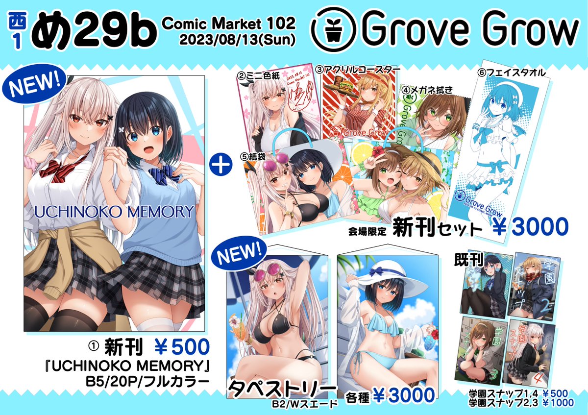 夏コミお品書きです!(※リプ欄に詳細あり) 2日目西め29b「Grove Grow」にてお待ちしてます! よろしくお願いします!✨ #C102お品書き