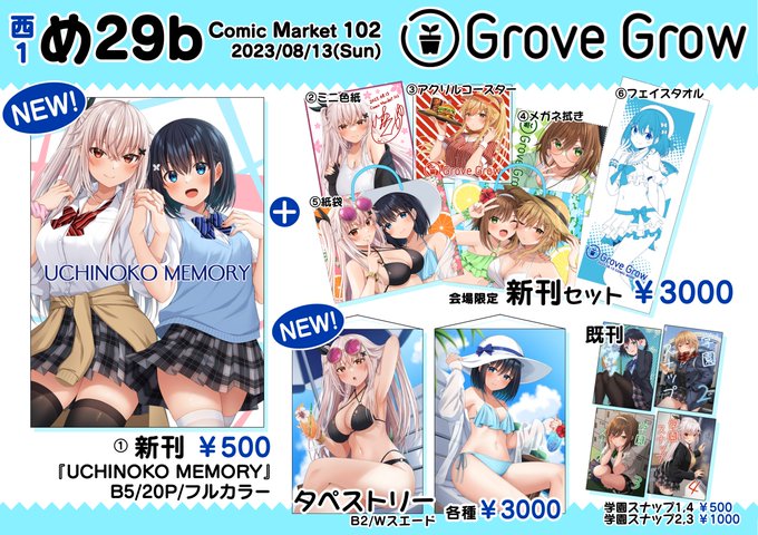 177 526 夏コミお品書きです!(※リプ欄に詳細あり) 2日目西め29b「Grove Grow」にてお待ちしてます! よろしくお願いします!✨ #C102お品書き 23/08/06 19:00
